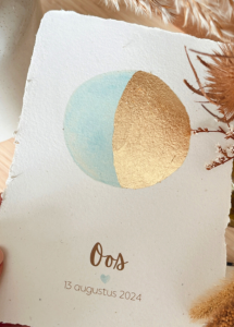 Een cadeau dat speciaal voor de baby is gemaakt, scoort altijd punten. Denk bijvoorbeeld aan een gepersonaliseerde maanstandposter met de exacte stand van de maan op de geboortedag van de baby. Wat het extra leuk maakt is dat jij het ontwerp samensteld. De kleur voor de maan kies je uit maar ook het lettertype voor de naam van het kindje. Daarnaast maken we de ontwerpen op verschillende soorten papier en met lijst. Extra bijzonder is het handgeschilderde ontwerp.
