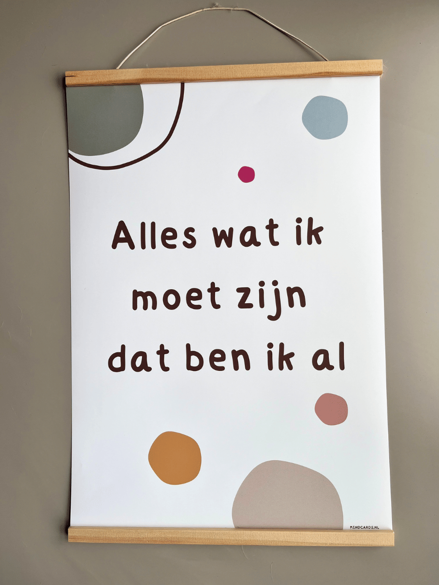 In een nieuw jasje! De affirmatie poster ‘Alles wat ik moet zijn dat ben ik al’ Waar op jouw slaapkamer mag deze poster shinen?? Laat je zelfvertrouwen groeien met de affirmatie poster van Mindcards kids.