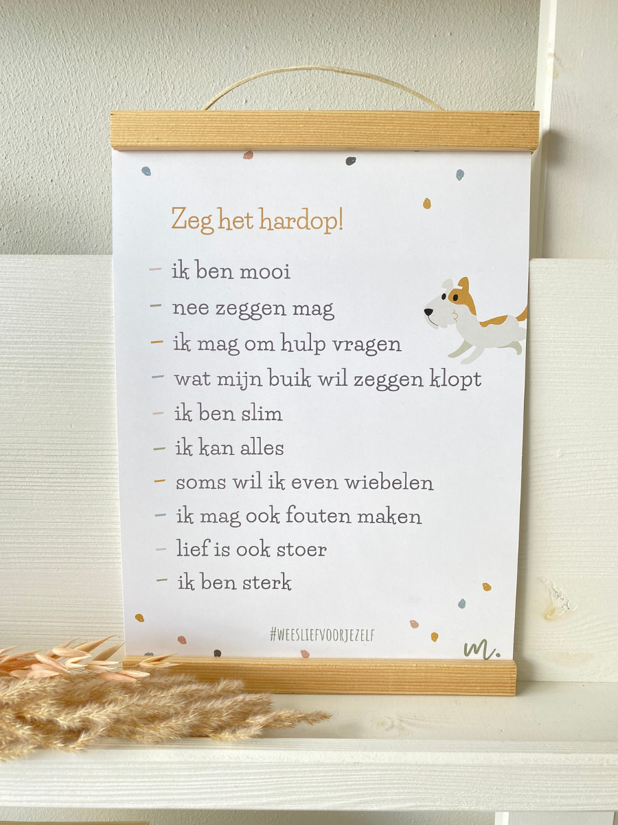 Het leuke hondje Pip op een poster met affirmatie zinnetjes.