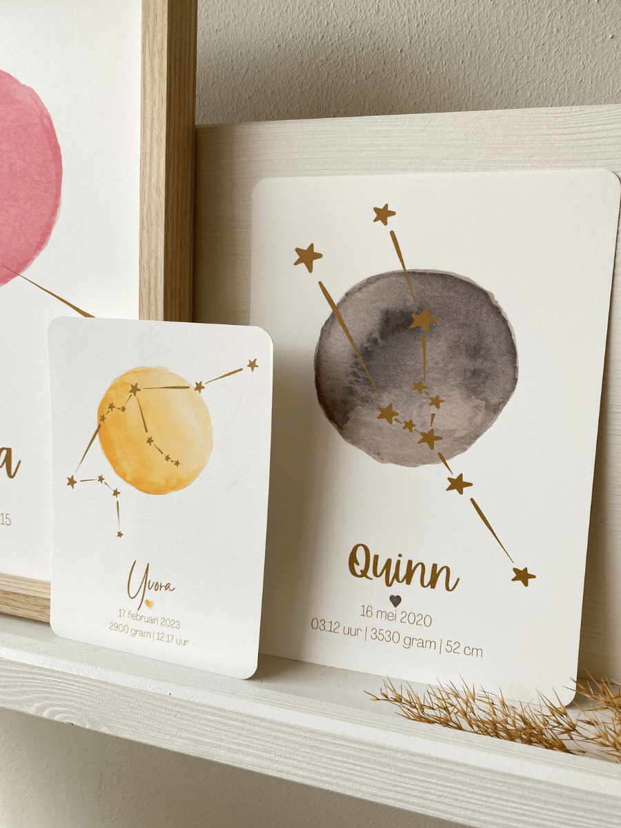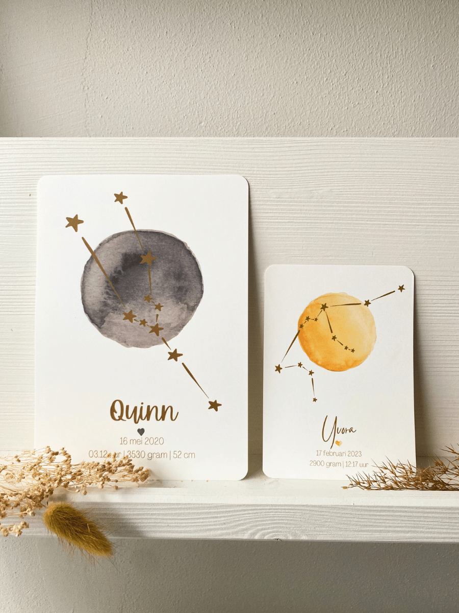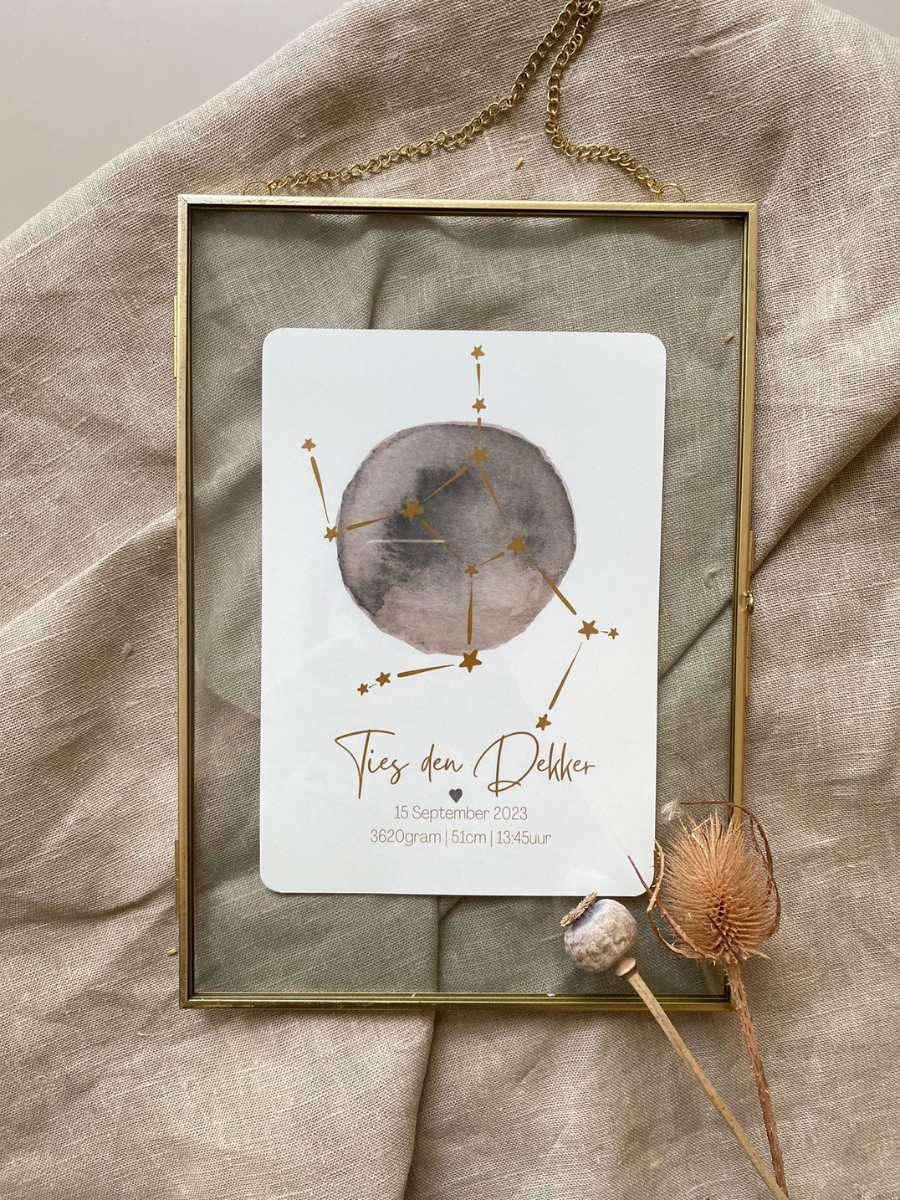 Een sterrenbeeld kaart met een aquarel maan, niet van handgeschilderd te onderscheiden, zo bijzonder mooi met het sterrenbeeld over de maan heen. Verkrijgbaar in 2 formaten.De kaart kun je zelf samenstellen, door de kleuren en lettertype uit te kiezen.