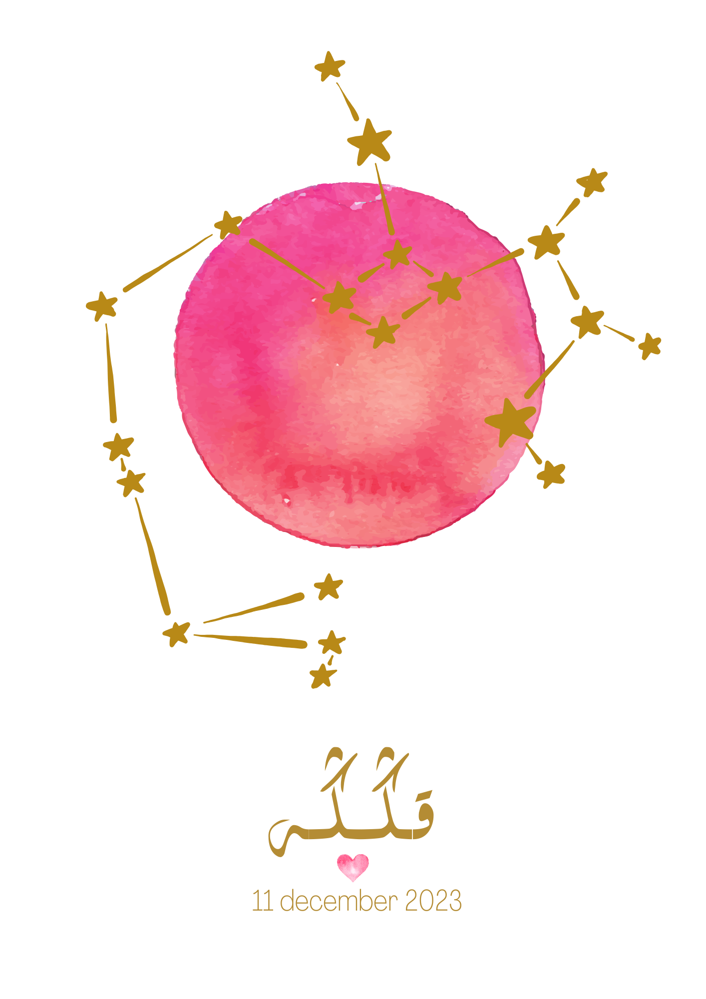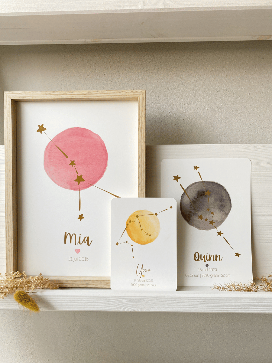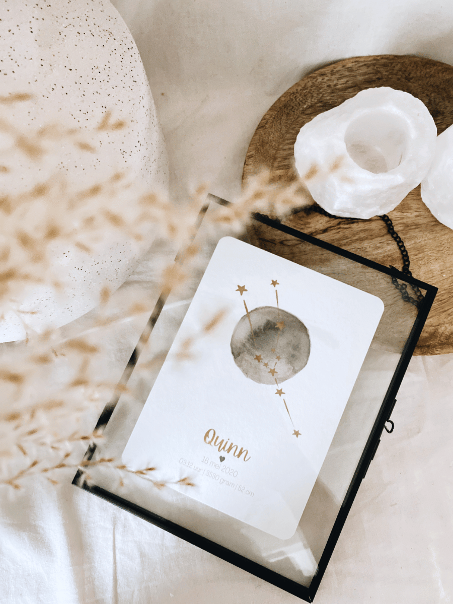 Een sterrenbeeld kaart met een aquarel maan, niet van handgeschilderd te onderscheiden, zo bijzonder mooi met het sterrenbeeld over de maan heen. Verkrijgbaar in 2 formaten.De kaart kun je zelf samenstellen, door de kleuren en lettertype uit te kiezen.