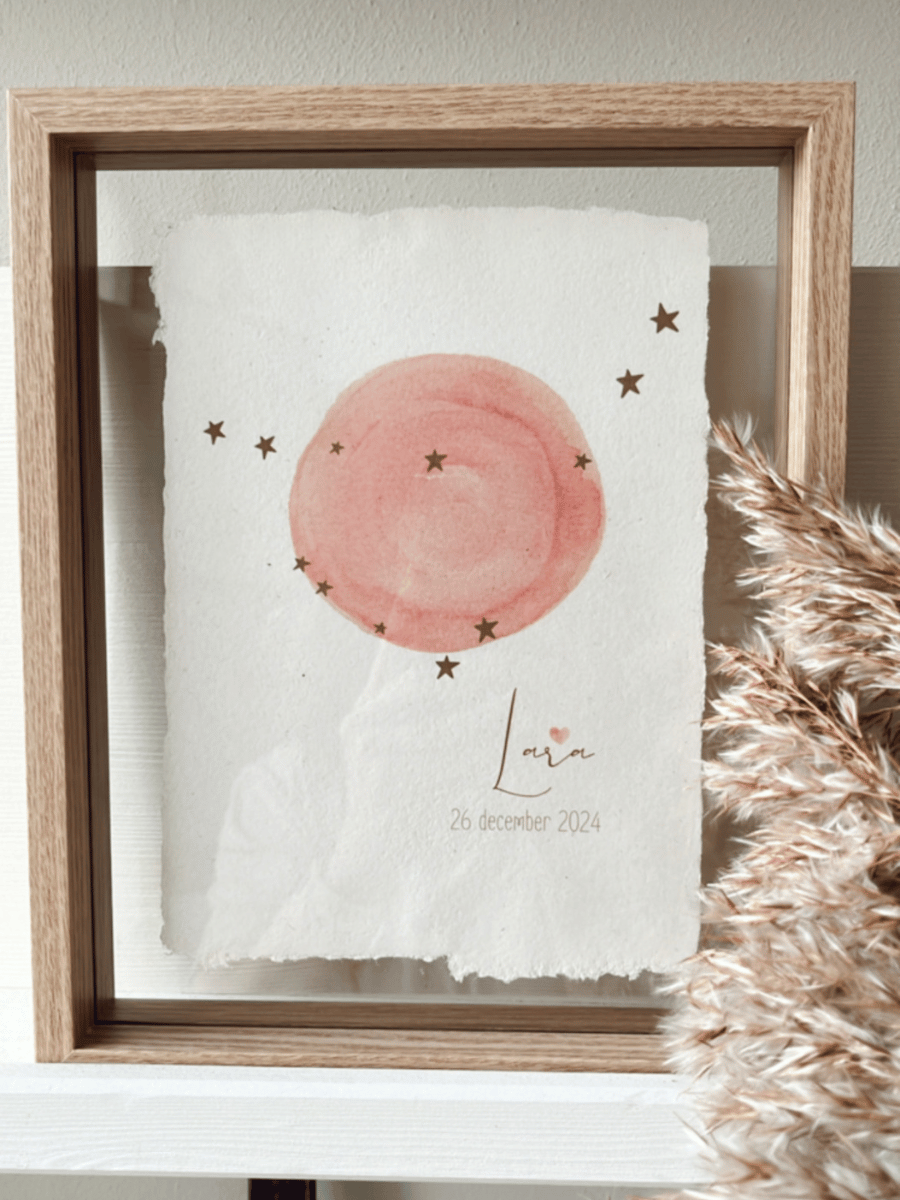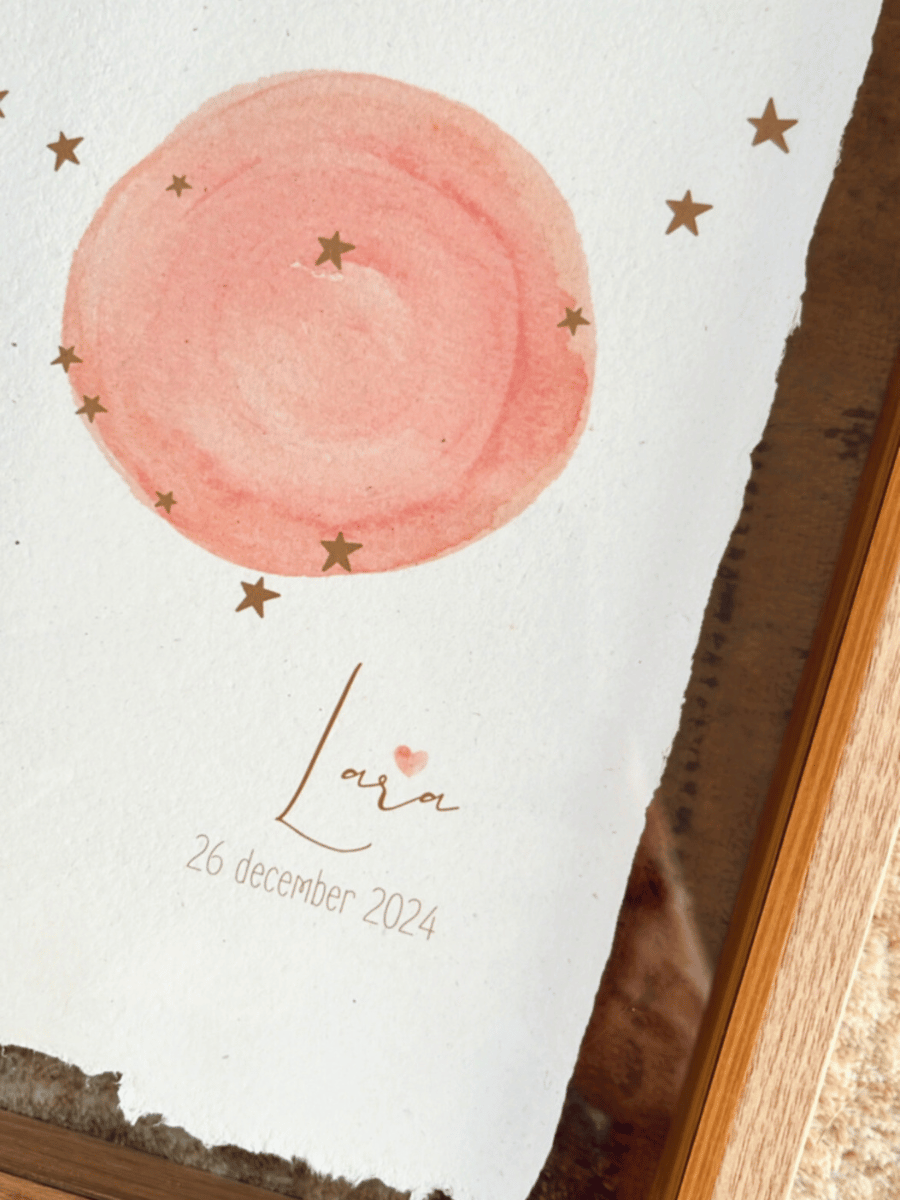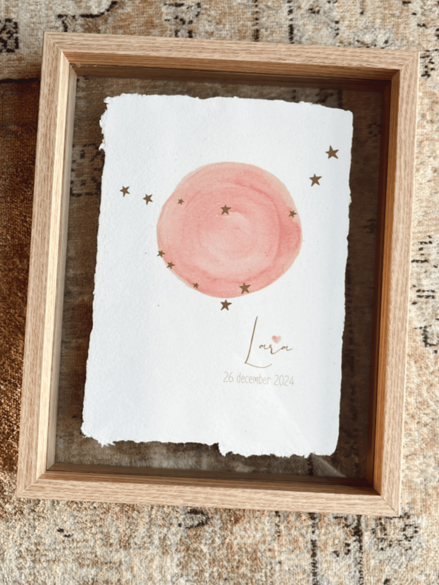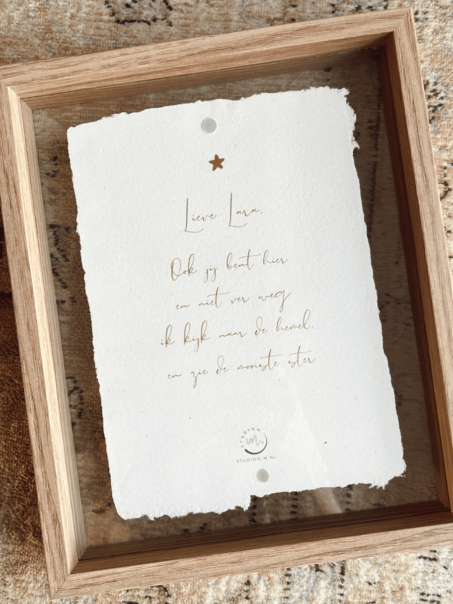 De sterrenkindposter op handgeschept papier in een prachtige dubbelglas lijst. Het handgeschepte papier maakt het ontwerp nog meer af.